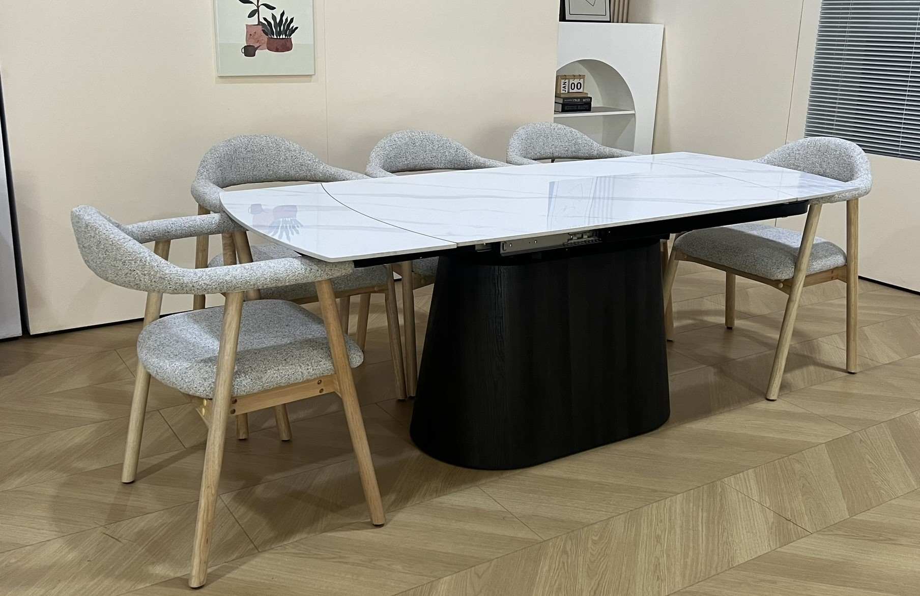 Elevate your dining experience with the Cleo Twist Dining Set, a perfect blend of modern elegance and practical design. The centerpiece, the Cleo Twist table, boasts a stunning marble-effect ceramic top with a seamless twisting extension mechanism, providing additional space for hosting guests with ease. Complementing the table are Hendrix chairs, designed with a soft, textured fabric upholstery and natural wood legs for a timeless look and superior comfort. The set’s neutral tones and sophisticated design make it an ideal fit for contemporary interiors, offering both style and functionality. Whether for everyday meals or special gatherings, the Cleo Twist Dining Set adds an air of refined charm to any dining space. Add Extra 2 chairs at a cost @ £120 per pair.
