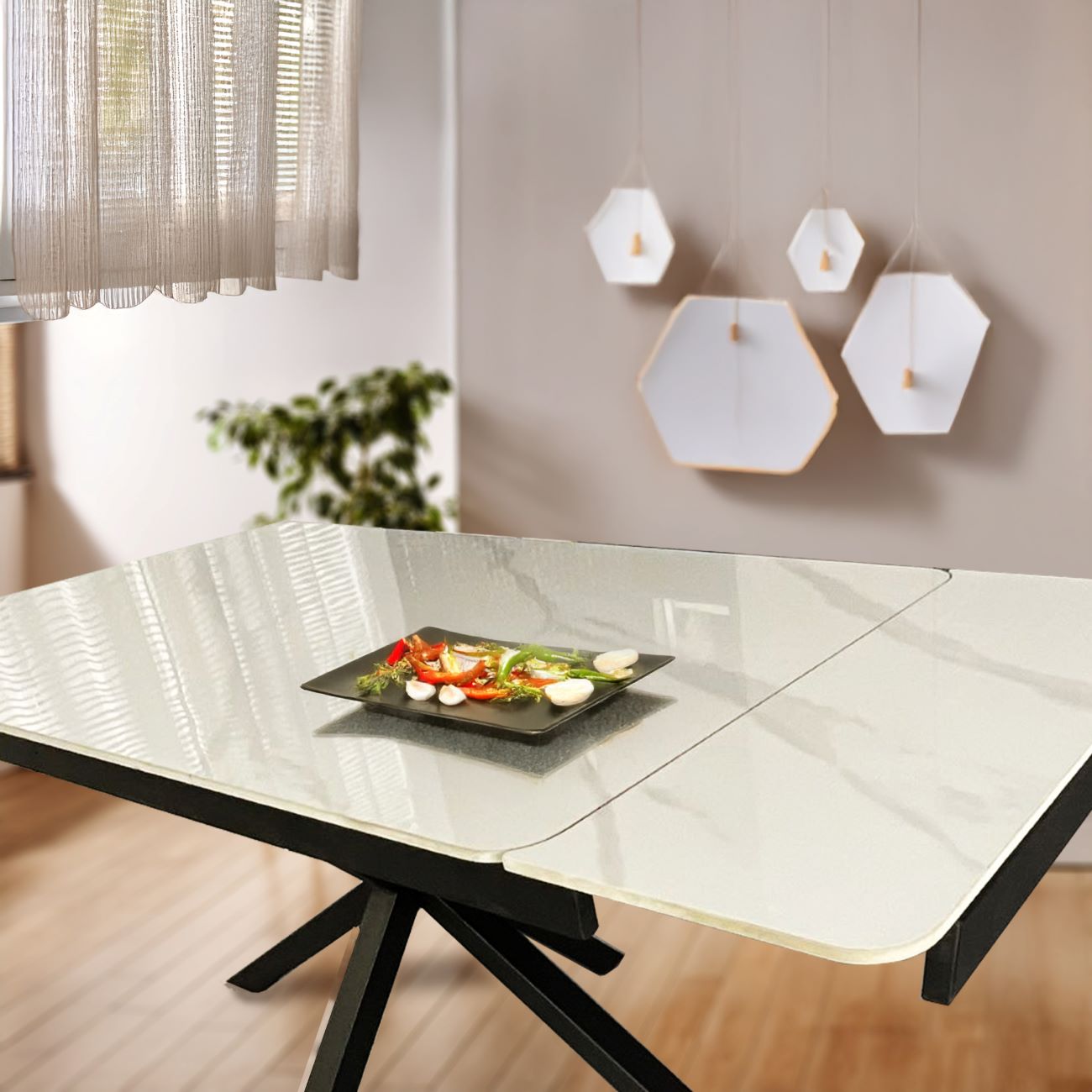 The Oxford Black dining table with a ceramic top brings modern elegance and durability to any dining space. Unlike marble, the ceramic surface offers a sleek, scratch-resistant, and easy-to-maintain finish while maintaining a luxurious aesthetic. Complementing the table are the Tulip 360 Auto Spin chairs in a soft white fabric, designed for ultimate comfort and convenience. With their plush upholstery, ergonomic armrests, and smooth swivel function, these chairs offer both style and functionality. This sophisticated set is perfect for contemporary dining spaces, combining practicality with refined design.