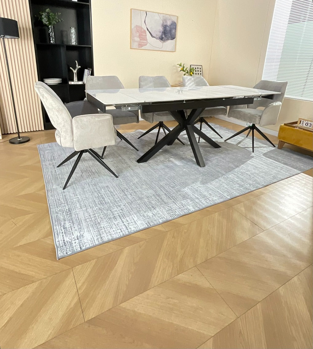 - Table: White marble-effect ceramic top with a smooth extending mechanism.