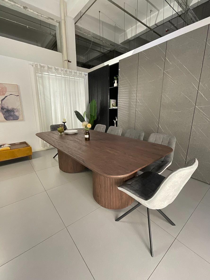 The Windsor table is a 2.4 x 1.2m long and combines architectural elegance with modern functionality. Its expansive rectangular tabletop offers ample space for dining, meetings, or creative pursuits, while the twin fluted column bases provide a distinctive design statement with excellent support. Available in two stunning finishes—rich walnut for a warm and luxurious feel or natural wood for a bright and airy aesthetic—this table adapts effortlessly to various interior styles. Perfect for hosting large gatherings or enhancing productivity, the Windsor Table blends craftsmanship, durability, and refined style, making it a striking centerpiece for any contemporary or transitional space.
