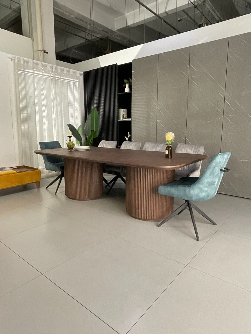The Windsor table is a 2.4 x 1.2m long and combines architectural elegance with modern functionality. Its expansive rectangular tabletop offers ample space for dining, meetings, or creative pursuits, while the twin fluted column bases provide a distinctive design statement with excellent support. Available in two stunning finishes—rich walnut for a warm and luxurious feel or natural wood for a bright and airy aesthetic—this table adapts effortlessly to various interior styles. Perfect for hosting large gatherings or enhancing productivity, the Windsor Table blends craftsmanship, durability, and refined style, making it a striking centerpiece for any contemporary or transitional space.